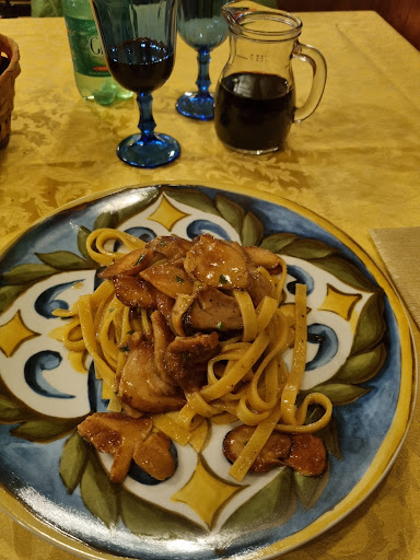 Read moreDurante il mio breve soggiorno nella graziosa Sacrofano ci sono andata 3 sere di fila perché....si mangia da Dio (a prezzi invitanti!). Trattoria di specialità locali: antipasti primi carne e pizza! Ho provato spaghetti cacio&pepe, fettuccine ai porcini e il petto alla brace più buono in assoluto: morbido e croccante, proprio come presentato dal cortese e gentile gestore! Ho trovato deliziosi i fiori di zucca fritti e ripieni di mozzarella e acciughe! Ampia proposta di bruschette con prodotti locali. Sapore intenso anche la cicoria ripassata con aglio&peperoncino. Materie prime notevoli e abilità nella preparazione. Dolci fatti in casa, nella norma il tiramisù. Apprezzabile lo sfuso rosso della casa. Ho notato che il pane va richiesto. Intenso il via vai per ritirare pizza d'asporto, che quindi presumo buona pur non avendola assaggiata. Le carni rosse sono in taglio minimo 3 etti. Disponibili menù degustazione completi e a prezzo abbordabilissimo (15eu). Il locale resta un po cupo (luci basse) semplice, spartano ma ambiente famigliare e accogliente....
