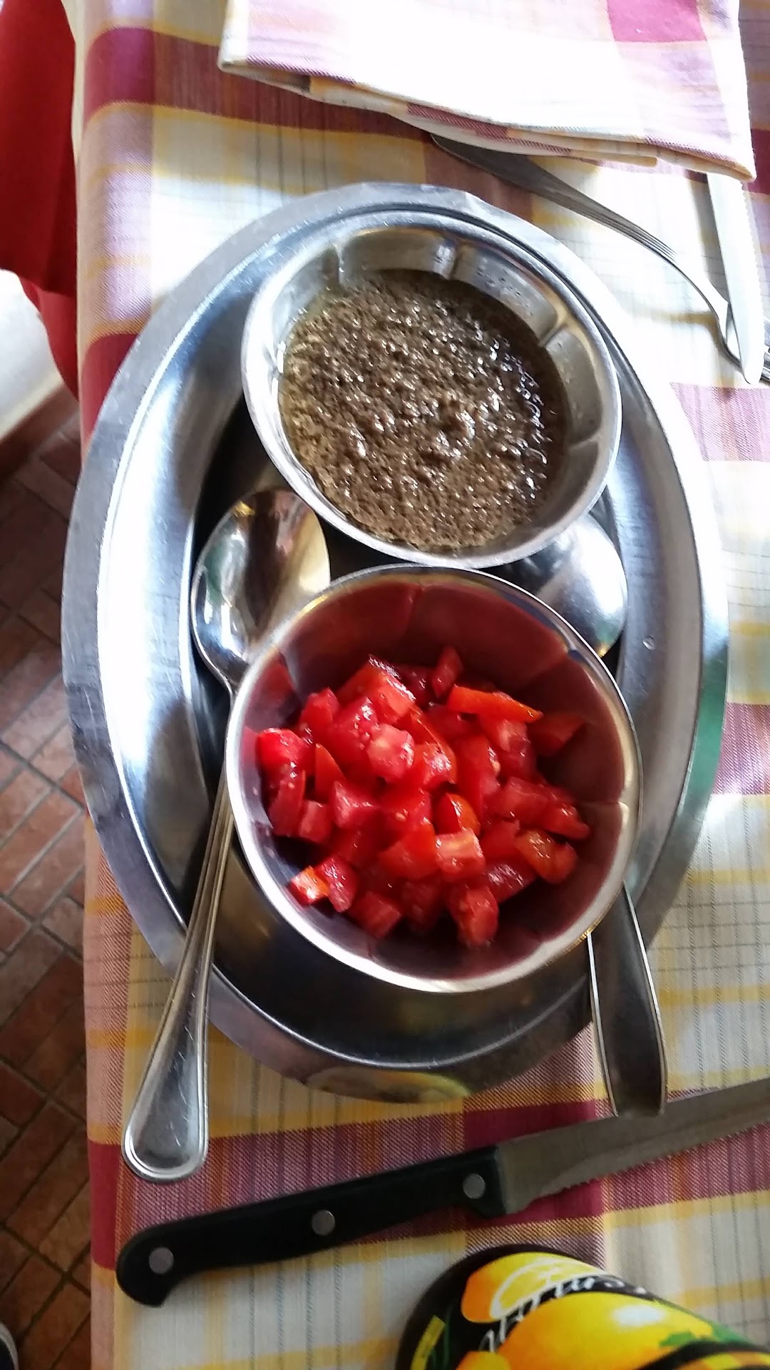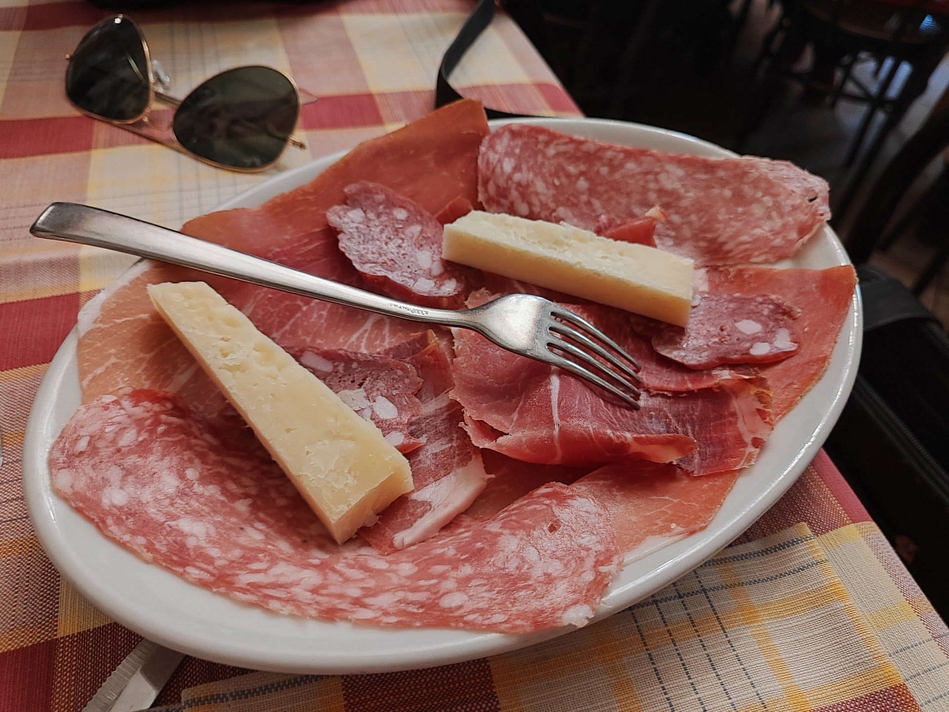 Dell'antipasto che posso dire, senza onore e senza gloria: 6 fettine di prosciutto crudo tagliato a mano, 4 strisce di scorze di pecorino (1cm x 1cm x 6 cm), 4 fettine di salame napoli, 6 bruschette all'olio con due vaschette di metallo con all'interno un pomodoro tagliuzzato e una cremina di funghi (dato il fondo di olio di conservazione ed il sapore, a mio parere, sembrava essere di barattolo);