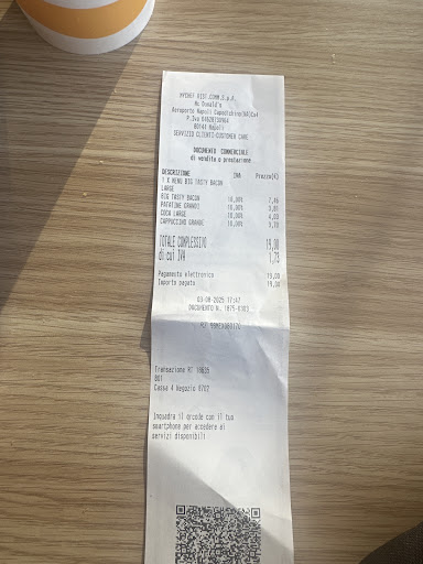 Absolutely unacceptable experience at McDonald’s Napoli Airport. Despite clearly ordering a Big Tasty Bacon Menu, the burger was missing the bacon entirely — even though it’s explicitly listed on the receipt. When we pointed this out, the staff rudely claimed that “bacon costs extra” – which is nonsense, considering we had ordered and paid for the Big Tasty Bacon.