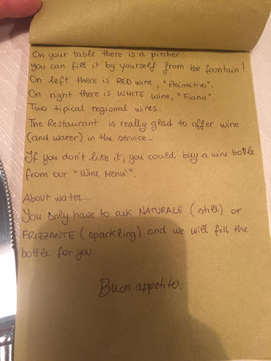 The staff was exceedingly friendly and happy. For a 2euro service fee, there is mineral water, sparkling water, AND red & white wine on tap. Serve yourself... yes, you heard that right- water & wine on tap.