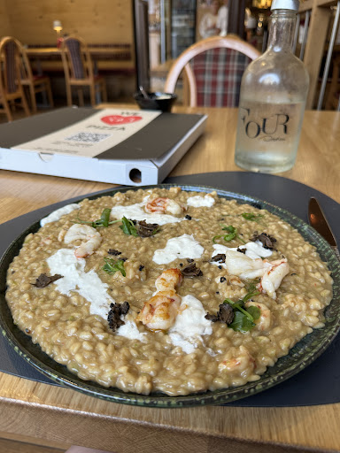 Came here by myself on a rainy day after a hike. It just felt a bit weird moment I set foot in. The indoor decor is a bit gloomy & outdated, the staff at the door who greets guests & showed them to table, the waitress who took my order, they barely smiled and acted coldly. I almost wanted to leave, but it’s rainy outside & I was super hungry, so I did stay. Most of the guests are tourists, came in a group, played with bar games. It just felt like a random roadside restaurant, again, the vibe is off, which is very rare in an Italien restaurant. The bottle of water was here, but my glass got stains of water spots on it. Flies flying around the table. I don’t know if I made a good choice to stay. But then the food came. The server who brought my food was the only one with a big smile & checked if everything is ok. And I started with their signature Risotto, with shrimp and truffle. Every discomfort and doubt disappeared. It’s an excellent dish of Risotto & very very well-cooked! Saw people coming in to get to-go pizzas, now I am very interested, ordered one margarita pizza to go & brought back to the hotel. Again, it tasted superb! If I could, I recommend getting their food to-go, and avoid dining-in. I don’t really feel welcomed or well treated as a guest, the atmosphere and service were off, makes me felt discomfort. I was traveling by myself as an Asian woman, if this is a point of information to add on to...