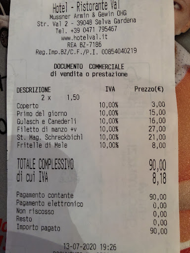 Read moreSono stato con mia moglie in questo ristorante annesso all’Hotel Val a Luglio 2020. Premesso che giro il Mondo da qualche anno il vero problema di questo posto NON SONO I PREZZI (che rimangono comunque alti). Ammettendo che si voglia fare selezione alzando il prezzo NON SONO AMMISSIBILI PORZIONI COSÌ RISICATE. Esempio: abbiamo scelto il primo del Giorno cioè Fusilloni con Finferli (funghi locali). Nel piatto vi erano circa 12 maccheroni e non più di 5 funghi.... PORZIONE ALTAMENTE INSUFFICIENTE. Prezzo 15 euro. Abbiamo preso Gulasch con Canederli (gnocchi di pane con speck cotti al brodo) stesso problema PORZIONE RISICATA. Abbiamo scelto un filetto di Manzo incluso contorno di patate al forno. Porzione carne indicata sul menù circa 300 grammi e patate : 5 di numero! Abbiamo preso come dolce delle frittelle di mele da inzuppare in crema. Stesso problema 3 frittelle piccole ed una micro ciotola di crema. A QUESTO RISTORATORE DICO: non entro nel merito dei prezzo (che allego in foto) ma almeno si regoli sulle Porzioni perché NON SONO CONGRUE. CARO GESTORE DEL CIASTEL DE VAL interpreti questa critica come costruttiva perché almeno il cliente si alzi dal tavolo sazio. Penserà così meno al prezzo pagato e sarà felice delle quantità! TORNEREMO A...