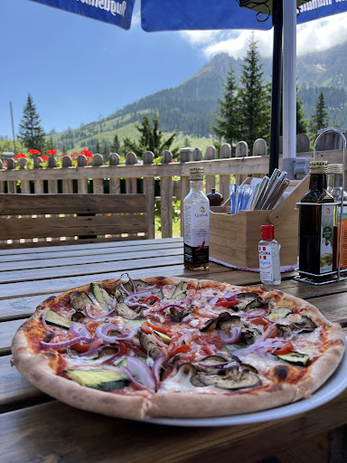 El ambiente del restaurante es típico de montaña: vigas de madera expuestas, chimenea encendida y una decoración sencilla pero muy cuidada, que resalta el encanto del lugar. Todo parece diseñado para que te sientas como en casa. Pero lo mejor de la experiencia fue, sin duda, la comida. Aunque podría esperarse una cocina más tradicional, me decidí por una pizza y quedé gratamente sorprendido. Era grande, con una masa fina y crujiente, generosamente cubierta de ingredientes frescos y de gran calidad. El equilibrio de sabores era perfecto, una combinación de sencillez y autenticidad que resaltaba con cada bocado.