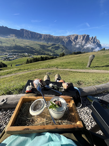Best views for this hiking area / loop (Bullacia) and the food was delicious. Many options for traditional Tyrolean dishes. We went for the cheesy dumplings with bacon, really tasty. Service with a smile and there are reclining chairs to soak in the views and sun at the same time. Was a big relief finding this place on the way back to our hotel in Compaccio after lots of hiking. We were here for 2-3 hours in the afternoon just relaxing in the sun, was quiet - most people had already got the cable car back down to Ortisei - so would recommend going here around 2/3pm if you are looking for peace and quiet. However I wouldn’t hesitate to go back anytime of the day - views can’t be beaten in this area...