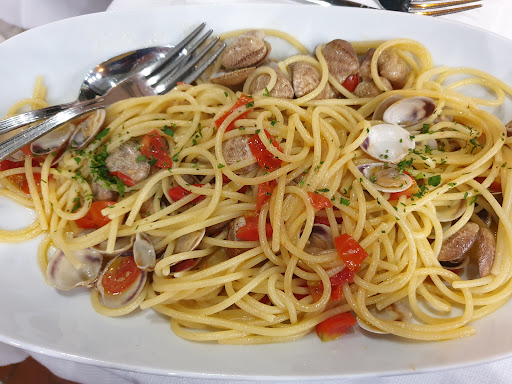 Ho iniziato il mio pranzo con le mezze maniche allo scoglio dal fresco sapore di mare e poi bis di primi con gli spaghetti alle vongole con pomodorini dolci e profumati.