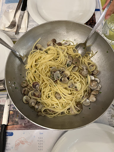 Io e il mio fidanzato siamo tornati dopo qualche anno in questo fantastico ristorantino sul mare e non siamo rimasti per nulla delusi. Il personale è sempre gentile, scherzoso e premuroso verso il cliente e il cibo è magnifico. Ci hanno fatto accomodare nella veranda di fuori e ci hanno subito serviti: abbiamo ordinato 1/4 di vino frizzantino, 1l di acqua, una frittura mista, una pepata di cozze e due spaghetti alle vongole. La frittura e la pepata (servita rigorosamente in padella) sono arrivate quasi subito e nonostante avessimo diviso i piatti in due, l'abbondanza degli stessi ci ha permesso di saziarci a dovere. Poco dopo abbiamo gustato gli spaghetti e che dire se non FANTASTICI! Arrivando nella padella in cui vengono cotti abbiamo potuto avere due bei piatti abbondanti e carichi di pesce. Qualità ottima di TUTTO. Eravamo sazi e non abbiamo preso dolci o caffè ma al momento del pagamento il ragazzo al bancone ci ha offerto una genziana e un liquore alla liquirizia entrambi ottimi, specialmente l'ultimo. In totale abbiamo speso 55€ che rispenderei molto volentieri per questa fantastica esperienza accompagnata dalle mitiche canzoni degli anni 80-90 che il locale mette di sottofondo...