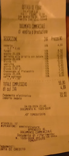 Lo scontrino ce l’ho, ma riporta solo il prezzo complessivo, senza alcun dettaglio: da lì non si deduce nulla. Non l’ho inserito proprio per non mettervi in imbarazzo. Meno male che sono pizze tradizionali, 12€ per una boscaiola manco a Porto Cervo. Il punto però rimane: se a ogni recensione negativa reagite mettendovi subito sulla difensiva, forse sarebbe meglio riconsiderare l’approccio, perché le recensioni dovrebbero servire a migliorare, non a...