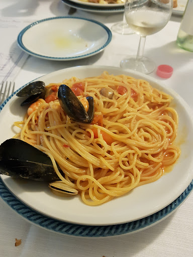 Read moreATTENZIONE: TI Spennano senza chiedere. Arrivati con una bimba ci fanno accomodare. Chiediamo acqua naturale e ci viene portato anche del vino, una bottiglia intera di vino della casa, dico che prendiamo solo un quartino e mi viene risposto che posso berne quel che me ne va anche niente. Ci viene chiesto cosa volessi ordinare senza menu e solo su richiesta ci viene portato. Prendiamo una pasta in bianco per la bimba piccola, due porzioni di spaghetti alle vongole (12€ sul menu) e un’insalata di gamberi (sul menu 8€) chiudiamo con un sorbetto al limone (3€) vado a pagare e senza battere nessun prezzo singolo il titolare mi dice sono 55 euro. Rispondo che ho la carta e dice meglio contante e alla mia replica che non lo avevo chiama un altro a farmi battere uno scontrino da 55 euro senza spiegazione del prezzo. Deduco mi abbia fatto pagare la pasta per la bimba 10 euro, e l’intera bottiglia di vino che dal menu dava 7 euro. In tutto ciò nel calice del vino erano presenti delle ciglia e la pasta era insapore. Insalata di gamberi discreta. Il sorbetto non era sorbetto ma una palla di gelato al limone da mangiare al cucchiaio e non con cannuccia. Bocciato sotto ogni aspetto. Vicino c’è...