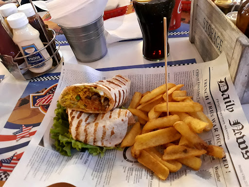 Il locale, situato in una zona industriale fuori porta, ha un'atmosfera da diner americano retrò che immediatamente cattura l'attenzione. La struttura piccola, sebbene affascinante, può risultare un po' claustrofobica, specialmente quando è affollata. Purtroppo, il giorno della nostra visita, siamo stati sfortunati nell'arrivare durante un orario di punta, e il posto era stracolmo di clienti. La mancanza di spazio e l'assenza di adeguato ricircolo dell'aria hanno reso l'atmosfera piuttosto opprimente, con un odore persistente di sudore e fritto che permeava l'ambiente.