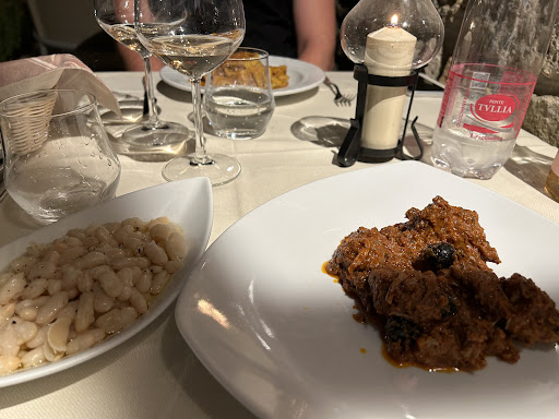 Food wise - delicious. We had the caprese Buffalo mozzarella salad to start, and I had the most incredible balsamic marinated steak of my life. The sauce was absolutely out of this world and I had no regrets (it was one of the more expensive things on the menu but 100% worth it.) Just a reminder that in Italy they don't serve sides with their meat dishes unless you order them, so don't forget to ask for the roast potatoes! My husband went for the wild boar stew which he loved (I had to share my potatoes which was fine, there were justtt enough for two!) For dessert we indulged in the lemon sorbet and the lemon torte - our favorite was the sorbet, creamy and a wonderful palate cleanser post a rich meal.