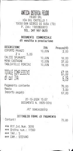 Il castello, con le sue mura in pietra, i soffitti a volta e le luci soffuse, crea un ambiente suggestivo e accogliente. La sala principale, dove si trovano i tavoli, è ben arredata, mantenendo un equilibrio tra lo stile rustico medievale e tocchi moderni che rendono il locale confortevole. Uno dei dettagli più affascinanti è la scala che conduce alla torre del castello. Salire questi antichi gradini è come fare un viaggio nel tempo, e una volta raggiunta la cima, si viene ricompensati con una vista mozzafiato sulla Valle di Susa. Dalla torre si può ammirare un panorama vasto e spettacolare, che da solo vale la visita al Feudo San Giorio, soprattutto al tramonto o nelle sere d’estate.