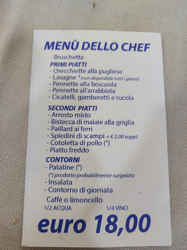 Read moreQuando siamo arrivati ho chiesto il menù e mi hanno portato un biglietto con un menù turistico ben presentato e vario con specialità locali a un prezzo di soli 18 euro.ho chiesto se potevo sceglie di non prendere il menù a prezzo fisso e ho ordinato per me e mia moglie 2 orecchiette pomodoro rucola e ricotta salata che ci hanno portato subito dopo soli 5 minuti.nel frattempo ho ordinato una Paillard con patatine fritte ma ho dovuto aspettare ben 40 minuti ,mentre tutti gli altri che hanno preso il menù turistico hanno mangiato primo secondo e tutto quello che avevano scelto del menù turistico morale se scegli il menù turistico mangi subito,altrimenti aspetta e spera ....comunque devo ammettere che il personale giovane e premuroso sono velocissimi per chiedere qualcosa li devi fermare al volo ,mi ricordano molto di quando lavoravo alla catena di...