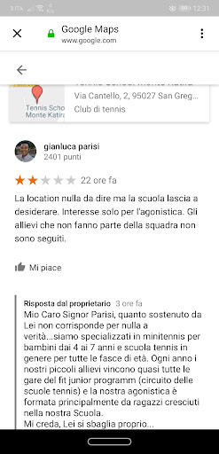 Read moreLa location nulla da dire ma la scuola lascia a desiderare. Interesse solo per l'agonistica. Gli allievi che non fanno parte della squadra non sono seguiti. Ho tolto una stella per la risposta alla mia recensione. Miei cari le recensioni non vanno replicate sono frutto della personale esperienza che ogni fruitore ha rispetto ai servizi che erogate. Non potete permettervi di dire "quello che dice non...