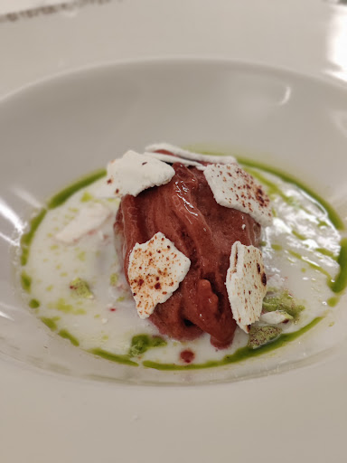 I dolci chiudono il pranzo con un sussurro, non con un grido. La meringa, fragile e delicata, si dissolve nel latte di capra dove annega un sorbetto di more che lascia il palato fresco e felice. E poi il sorbetto d’ananas con crumble di cioccolato bianco: un’esplosione tropicale bilanciata dalla dolcezza vellutata del cioccolato.