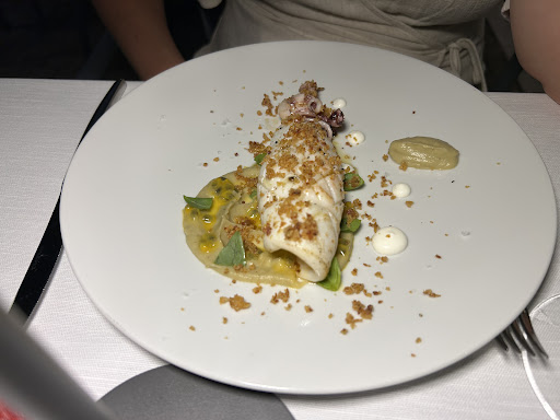 Partiamo col menù che si divide tra uno per il pranzo, e un menù alla carta per la sera, con possibilità di menù a degustazione! La scelta è variegata e bilanciata con un buon equilibrio tra piatti di carne, pesce e vegetariani, privilegiando prodotti di stagione e del luogo! La qualità delle materie prime è stata eccezionale! Ogni piatto raccontava la storia di ingredienti freschi, selezionati con cura e cucinati con maestria ed esperienza! È chiaro che non ci vuole un cuoco professionista per notare tutto questo! Inoltre, abbiamo ricevuto un entrée, accompagnato da una selezione di pane, focaccia e piadina (ovviamente tutto fatto in casa con lievito madre) e da un ottimo olio EVO biologico del luogo! Se questo non bastasse ci è stato servito pure il pre-dessert prima del dolce!!