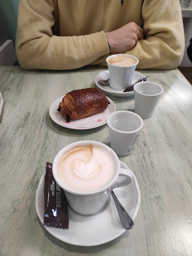 Read moreUn piccolo bar nel centro di San Mauro che ho scoperto di recente e che di sicuro frequenterò più spesso in futuro malgrado sia per me un po fuori mano. Gentilissima la ragazza che mi ha servito al tavolo, servizio impeccabile, buon caffè servito insieme ad un biscottino e un bicchierino d'acqua. Bravi! Croissant alla marmellata e ai cereali molto buono e alla giusta temperatura. Bravi! Parcheggio per bici e acqua e biscotti a disposizione dei cuccioli che accompagnano gli avventori. Bravi! Unico piccolo neo, il locale un po' piccolo. In compenso è arredato con gusto e originalità, e nelle belle giornate ci si può rilassare nel dehor...