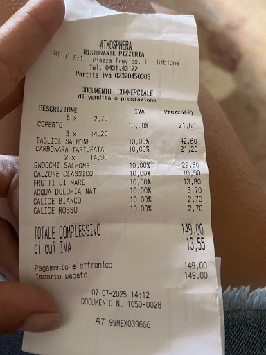 Read moreWe had a lunch here today, 8 people. Food was good, salmon pasta dry. What shocked me was a charge for Coperto -2,70eur per person. When I asked the waiter why am I paying 20 eur extra, he answered it is for aircon, olive oil and everything….. we did not get ANY bread sticks before meal, nothing, no cheese NOTHING !!!! only had olive oil on the table and balsamic vinegar… that is it!! We paid for water,, when I was paing at the cash register I asked the waiter if tip is included he said not so I tipped him with five euros… and then I found out that I already paid 20 eur for NOTHING just to sit there with aircon above my head !!!!! Would never go back to this place and would not recommned to others either!!! This is scam !! You CAN NOT CHARGE PEOPLE FOR SOMETHING YOU HAVE NOT DELIVER !!!!!! Waiter told me after I aksed about it, that it is not his rule … yes I believe so but as a waiter who is charging the price to the customers you suppose to know that you MUST provide value for this charge customer is later...