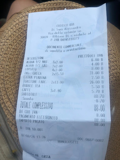 Read moreOk che i prezzi sono sia sul listino che on line,ok che siete in una delle spiagge più belle del litorale (tenendo conto che il bello è soggettivo) saranno anche esposti in bella vista e non li ho visti, ma siamo sinceri in VENETO NON SI PUÒ PAGARE 6,5 € per UNO SPRITZ !!!! ---Chiosco Oda Bibione (proprietario) 6 giorni fa Valeria ci dispiace leggere la tua recensione, in parte ti sei già risposta da sola, i nostri spritz vengono serviti con degli apetizer in sacchetto monodose quindi è sicuramente un ottimo ed abbondante aperitivo!--- Questa è la risposta del proprietario, purtroppo non so come rispondere o come fare un'altra recensione quindi modifico questa: Abbondante per me è un'altra cosa, stiamo parlando di taralli e patatine confezionate anche la definizione di ottimo mi sembra esagerata!! vedo che in molti si lamentano dei prezzi quindi forse non siete così trasparenti. Io non guardo mai il listino per sapere quanto costa lo spritz perché è ignobile farlo pagare più di 5 euro. Potete rispondere con tutte le scuse che vi vengono in mente ma per me non è un posto in cui tornerei (non sentirete di certo la mia mancanza) o che non...