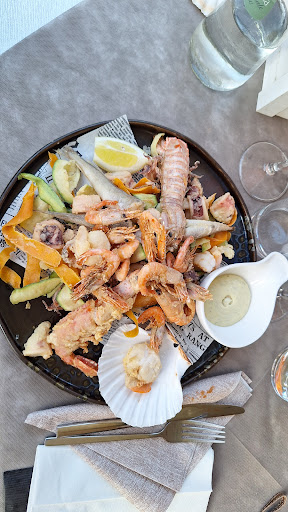 Abbiamo cenato ieri sera (sabato 17/07/25) prenotando un tavolo x 4 adulti. Ambiente piacevole x i tavoli all'esterno coperti con maxi ombrelloni, apparecchiati con tavoglia e tovaglioli di carta. Brutto il vaso d'olio e 2 spargisale/pepe spartani lasciati sul centro. Piatti di pesce ben presentati e gustosi. Tremendo il servizio effettuato palesemente da camerieri (molto gentili) ma inesperti e bacchettati continuamente dal titolare in maniera plateatica di fronte ai clienti. Il titolare è stato il motivo per il quale non torneremo più. Molto infastidito e aggressivo mentre stavamo elencando le portate che avevamo scelto. Capisco la tensione x una serata "difficile"....ma ci si deve saper controllare. PS un piccolo consiglio al titolare: si vesta in maniera più consona se sta davanti ai clienti. T-shirt e pantaloni logori, sviliscono molto. E nn è un mio "gusto oggettivo" ma un...
