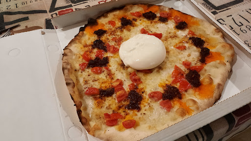 Read moreHo chiamato alle 19.40 per ordinare due pizze: una piccantissima "fai te, io mi fido" e una cotto e funghi. Pronte già per le 19.50. Arrivo a prenderle e il titolare mi dice che c'è andato giù pesante. Sfida accettata. Arrivo a casa e, effettivamente, ha fatto del suo meglio. Superlativa, una pizza veramente ASSOLUTA. Tabasco, 'ndujia, peperoncino habanero in polvere, poco gorgonzola e una mozzarella di bufala al centro. Una meraviglia, assoluta, appunto. Quasi dispiaceva di mangiarla. Ah, c'erano anche i pomodorini per tenersi leggeri. Ma l'ho mangiata tutta. Alla...