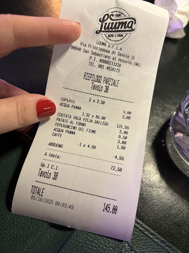 Read morePurtroppo abbiamo vissuto una brutta esperienza in questo locale. Il posto è bello, il personale è cordiale ma privo di serietà e trasparenza. Abbiamo richiesto la carne “Swami Danese” (7.5€ l’etto) ci è stato semplicemente detto “No ragazzi, questa no” senza aggiungere nient’altro. Ci è stata quindi consigliata una carne a detta del cameriere con un buon sapore, non troppo magra ma nemmeno eccessivamente grassosa senza specificare se il prezzo fosse uguale alla carne non disponibile da noi richiesta o più cara. Inoltre il cameriere ci specifica che aveva un peso di circa 700/800 grammi. La carne servita non aveva un sapore spettacolare e in più era strapiena di grasso, tant’è vero che uno dei camerieri ha notato i nostri piatti pieni di grasso da noi scartato. La cosa più grave è che al momento del conto abbiamo trovato una carne non presente sul menù (infatti nessuna carne citata nel menù ha un prezzo di 9.50€ l’etto come riportato sullo scontrino) e con un peso nettamente superiore. In sostanza 145.00€ per una fetta di carne e 2 contorni; a questo punto mi ritengo fortunata a non aver ordinato antipasti, dolci e vino. Ve ne avrei dati anche 170/180€ ma non per mangiare una carne del genere e sopratutto senza farmi prendere in giro in...