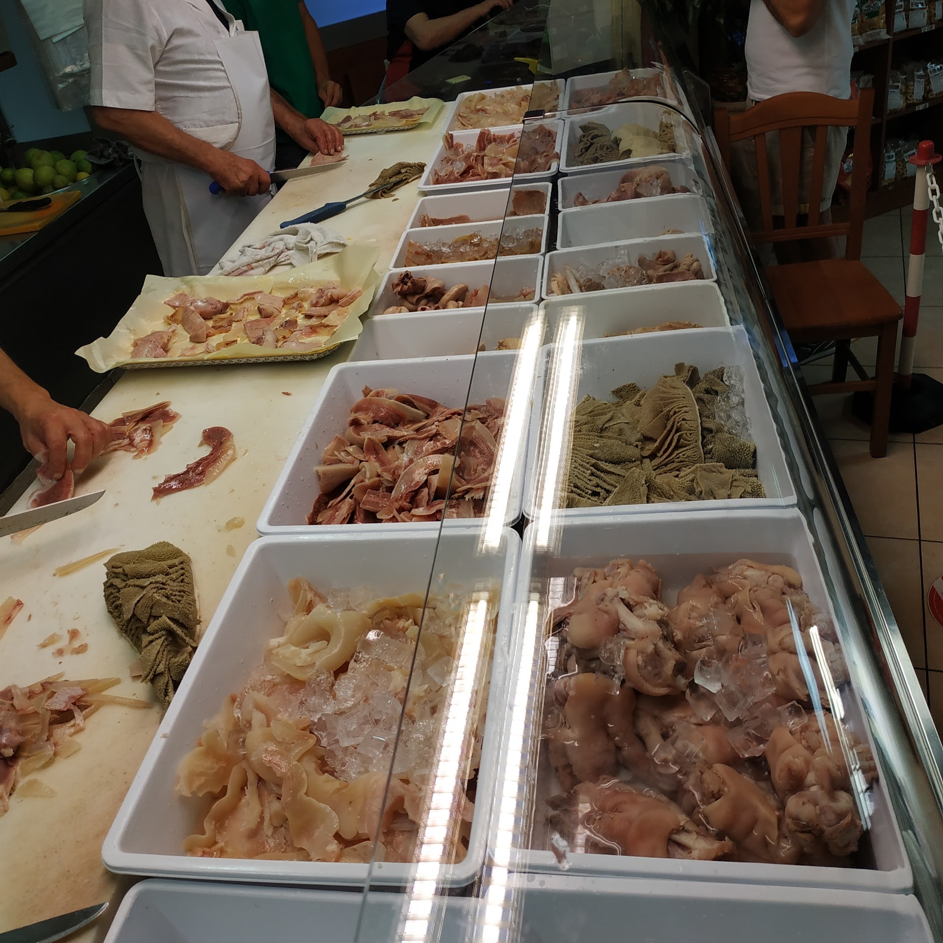 Da appassionato del genere, non potevo non recarmi qui in pellegrinaggio per assaggiare il per e muss di Francesco. Si tratta di un locale alla buona in una zona industriale, per questo è frequentatissimo dai camionisti a tutte le ore. E questo è uno dei sigilli di garanzia sulla qualità. Al banco, Francesco e altre due generazioni assemblano gustosissime insalate con il meglio dei tagli della trippa: non solo piede e muso, ma anche centopelle, zizza (mammella), muso piccante e matrice (utero), accompagnati da fettine sottili di finocchio, olive verdi e lupini. A seconda delle dimensioni, le vaschette sono da 5 (per una persona), 10 o 15 euro. Per annaffiare, una birra gelata è il top. L'interno è alla buona, con pochi tavoli di legno ed un solo stuzzicadenti di legno come posate. Il posto è ideale per una serata goliardica tra amici, ma fate attenzione perché c'è folla già alle 16, loro orario d'apertura. Inutile dire che muso e altre frattaglie sono freschissime e squisite. Non c'è coperto, quindi il conto è quanto pagate. Consiglio a tutti una deviazione, specie a chi...