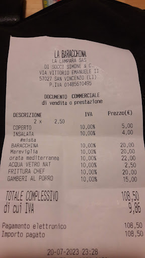 Cercando su internet un locale dove cenare l'ultima sera a San Vincenzo, leggendo le varie recensioni, il mio sguardo è caduto su questo ristorante, apprezzato per la vista ed il rapporto quantità/prezzo. Arrivati alla Baracchina ci sediamo al nostro tavolo, il più possibile in disparte, come avevamo chiesto, vista la presenza dei nostri barboncini piuttosto "territoriali". Al momento dell'ordine ci viene detto che il Cacciucchetto di Polpo e Calamari, piatto che più mi aveva ingolosito sfogliando le foto, era esaurito; ripieghiamo quindi sulla classica Frittura dello Chef oltre a due primi, Spaghetti con Vongole e Pesto di Pistacchio e Fettucce alla Baracchina. Devo dire che gli Spaghetti sono un piatto ben riuscito, perfettamente mantecato e con vongole che ingolosivano solo alla vista, mentre riguardo alle Fettucce purtroppo, oltre a risultare un po' scarse a "fine sgusciatura" ed alquanto sapide, alcune erano quasi crude; sarebbe inoltre una gradita cortesia verso il cliente se il carapace di alcuni crostacei piuttosto coriacei , come Cicale e Scampi, venisse inciso per facilitarne la rimozione; a fine impresa, visto la generosa quantità di pescato, la pasta risulta fredda e la camicia bianca appare come un campo di battaglia. Riguardo alla Frittura dello Chef, piuttosto ricca di verdure e spaghetti fritti, era molto asciutta ed i Calamari buoni, mentre i gamberetti erano letteralmente due e la qualità non ne giustificava l'esigua quantità. Purtroppo a rendere la serata "non gradevole" è stata la vasta esposizione del locale agli agenti atmosferici, con un forte vento che investiva tutti i commensali; errore nostro non portarci una felpa andando a mangiare così vicino al mare a fine stagione, ma come noi aveva sbagliato la maggior parte delle persone sedute agli altri tavoli, tutte alquanto intirizzite ed intente a rannicchiarsi, coprendosi e scaldandosi con le mani. Personalmente avrei gradito se verso la fine della serata, con molti tavoli vuoti essendo l'ultimo turno di servizio, ci avessero invitati a spostarci più all'interno abbassando poi le tende in plastica ed altri infissi per riparare i clienti dalle intemperie; così non è stato fatto e siamo letteralmente scappati, rinunciando a dolce e caffè, per il troppo freddo. Locale da provare esclusivamente nelle calde sere d'estate, rapido il servizio; rapporto qualità/prezzo direi...