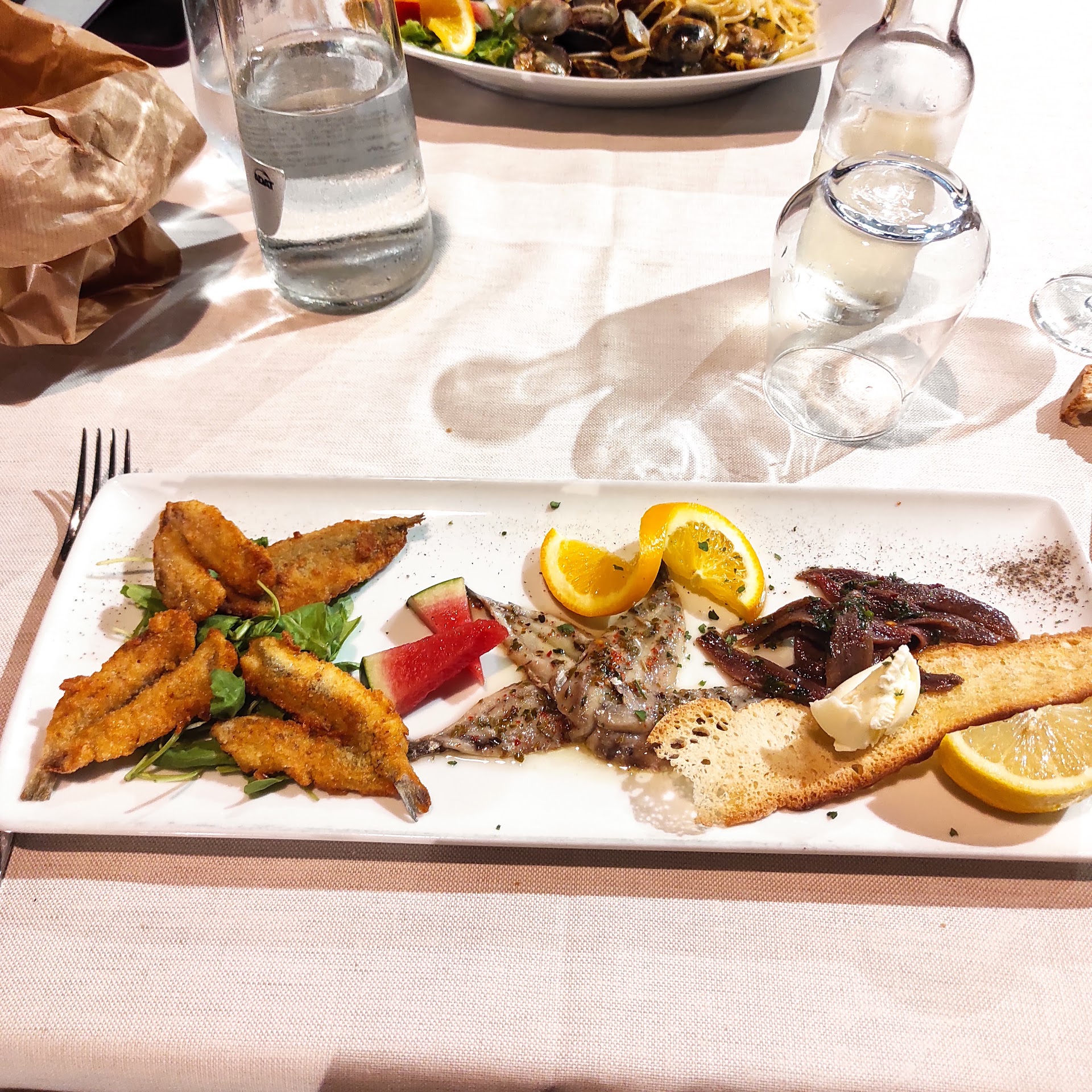 Ci sono tornato a distanza di 2 settimane, a cena. Siamo stati accolti molto gentilmente, senza prenotazione, nonostante la serata fosse tra le più "intense" della stagione a causa della fortissima affluenza di clienti. Da notare che, in altri ristoranti, precedentemente "visitati", siamo stati respinti nonostante l'orario non fosse esattamente scabroso ( 21.00) con motivazioni varie e variopinte tra cui "la cucina chiude alle 21.30 (!!!! Nemmeno fossimo in Svizzera anziché in una rinomata località di mare, in pieno agosto!). Abbiamo aspettato giusto 15 minuti e dopo averci fatto accomodare ad un buon tavolo, all'esterno (meglio, faceva molto caldo quella sera) abbiamo potuto ordinare subito. Tris di alici, presentato bene, gustoso e saporito. Impepata di cozze spettacolare. Spaghetti ai lupini (poi arrivati con molte vongole veraci) molto gustoso e bilanciato, fritto misto con anche le alici non male. Abbiamo speso il giusto. Siamo stati trattati bene, come...