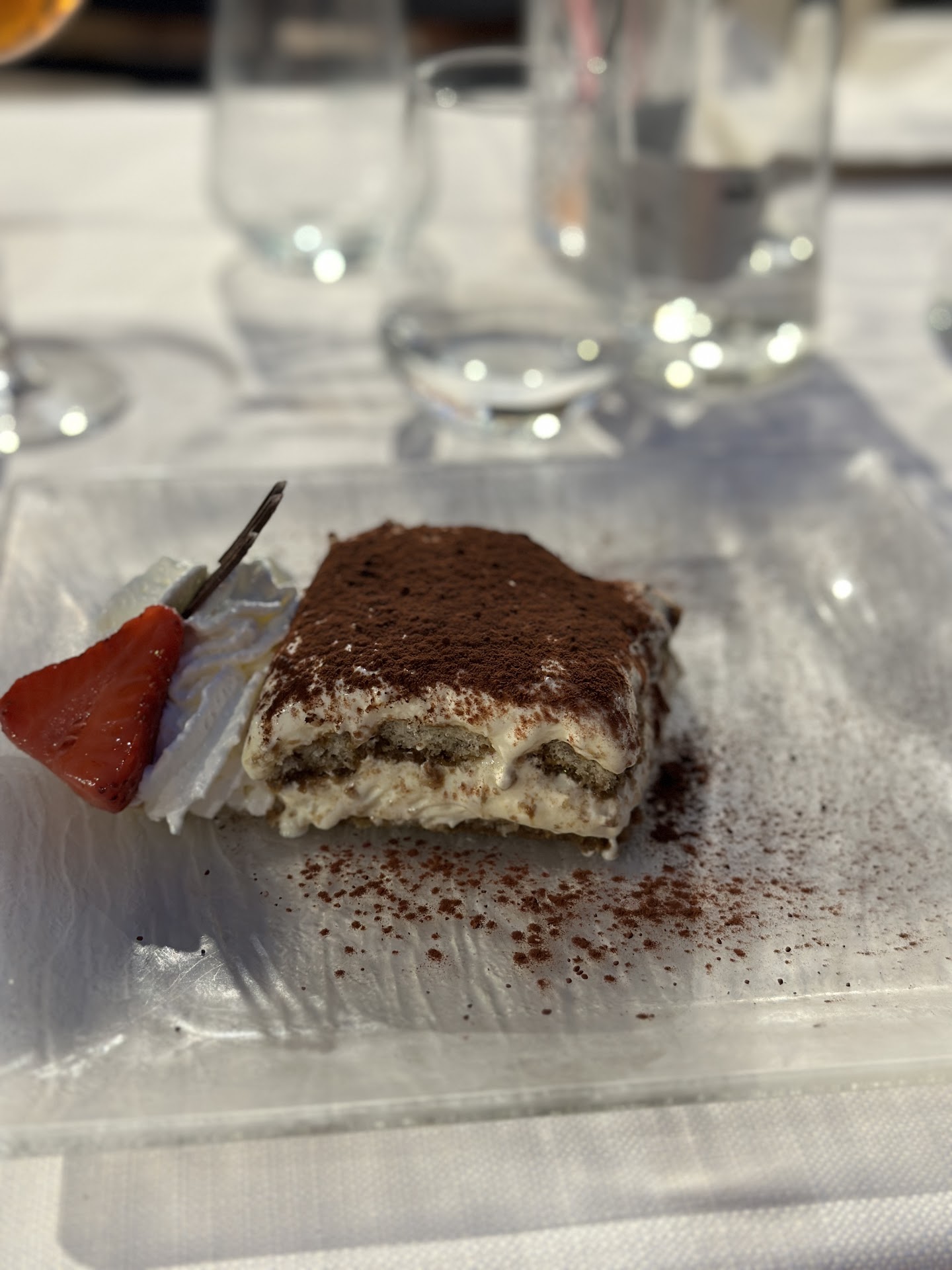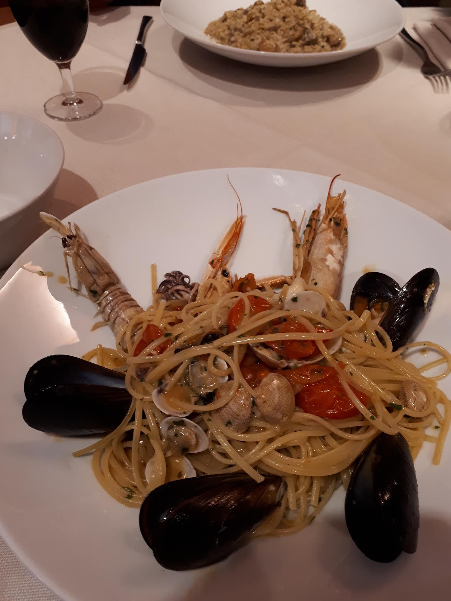For the mains we had the Seafood Spaghetti and Risotto with Porcini and some kind of offal. The Seafood Pasta is still great - still one of the best places to get this meal - and is served in a pan, where they finish preparing it at your table. The Risotto was new to us....interesting combination of mushrooms and some offal and very filling. We had some house wine with that (half liter for 4 Euros!).