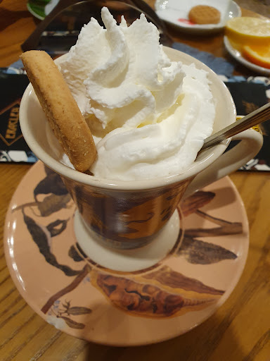 Ci siamo state un giorno dopo cena ed era uno tra i pochi bar aperti, se non l'unico. Il locale si trova in centro. C'è una vasta scelta tra cioccolate calde, tè caldi e succhi. Abbiamo preso una cioccolata bianca e un tè ananas e cocco. Entrambi son state servite con un piccolo biscotto, pensiero molto carino. Anche le tazze erano molto belle. La signora che ci ha servito è stata molto cordiale e sorridente. Il locale ha diversi posti a sedere, sia fuori che dentro. Dentro c'è anche una bellissima parete con diverse bottiglie e un tavolo d'altri tempi....