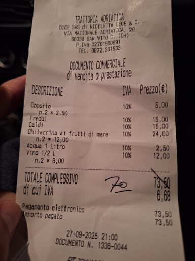 Read moreSiamo stati a cena in questo locale, io e mio marito, con l’idea di gustarci un buon piatto di pesce. Purtroppo l’esperienza non è stata all’altezza delle aspettative. Appena seduti abbiamo chiesto uno spaghetto alle vongole, ma ci è stato subito detto che non erano disponibili. Abbiamo quindi ordinato un antipasto misto (30 €) e due chitarrine allo scoglio. L’antipasto, a nostro avviso, non era poi così ricco: tra i caldi mancavano perfino le classiche sautè di cozze e, ovviamente, le vongole non c’erano. Per 30 euro ci aspettavamo sicuramente qualcosa di più adeguato. La delusione più grande sono stati i primi: più che “allo scoglio” sembravano semplicemente con cozze e calamari, insapori e ripetitivi rispetto all’antipasto. Nel mio piatto c’erano anche un paio di gamberetti, in quello di mio marito nemmeno quelli. Abbiamo fatto presente la cosa al personale, specificando che non avevamo gradito i piatti, e ci è stato applicato uno sconto di 3,50 €. Non è certo una questione di sconto: eravamo usciti con la voglia di una bella cena di pesce, e siamo tornati a casa delusi. Purtroppo non torneremo e facciamo fatica a capire le recensioni tanto positive che avevamo letto prima di venire. Dimenticavo, abbiamo chiesto del peperoncino ed è arrivato già consumato da altri che sicuramente l'avranno maneggiato. Avrei altro da dire e anche documento ma...