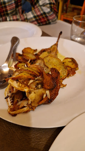 Come secondo, abbiamo deciso di condividere una pescatrice. Nessun menù è stato portato al tavolo, ma vicino alla cassa c'era un cartellone che diceva che il suo prezzo era di 5€ a etto. Ok!