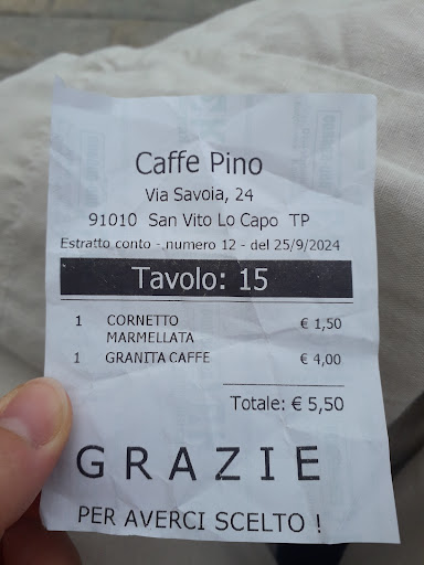 Un bel giorno di primavera, cosa fare? Passeggiata a San Vito Lo Capo "coronata" da un buon gelato. Dopo aver fatto il giro delle migliori gelaterie e aver verificato che erano tutte chiuse, decidiamo di sedere ai tavolini esterni da Caffè Pino. Un caldo-freddo piccolo al caffè, una coppetta al caffè con panna, un caffè, acqua naturale piccola. Dopo pochi secondi, arriva un signore scoppiettante di mezza età a portare il caldo-freddo, con la mascherina completamente abbassata sotto il mento e parlando allegramente sul caldo-freddo mentre lo poggiava sul tavolo e ci parlava addosso x essere sicuro che le goccioline della sua saliva ci cadessero addosso... Faccio un salto con tutta la sedia e gli chiedo di allontanarsi immediatamente. Arriva la coppetta col gelato al caffè, stavolta con la mascherina, l'acqua e la tazzina con il caffè, l'unica a contenerne un pò, nel gelato c'era solo il latte. Avevo deciso,x una volta, di non dire nulla, ma quando vedo il conto e, soprattutto, quando vedo che cercano di rifilarmi uno scontrino non fiscale, non mi trattengo e dico chiaramente che il caffè non era presente nel gelato al caffè, che dovrebbe avere un color caffè e non un bianco-beige e che il gelato e la panna non dovrebbero essere sciolti x metà, ma avere una certa consistenza da gelato. Ovviamente il tipo del bar (Pino?) non era d'accordo con me. Aggiungo la foto di quello che mi volevano rifilare come scontrino (ovviamente ho chiesto quello fiscale) così potete vedere il dettaglio dei prezzi, aggiungo che il caldo-freddo era piccolo. Cmq non discuto i prezzi, ma il cibo DEVE essere buono. Se non volete rovinare la vostra bella giornata di sole a San Vito Lo Capo, non andate al Caffè Pino, ma da qualche altra parte, sperando che non siano tutti chiusi. In totale abbiamo pagato 12,10 per 1 caffè (1, 30), un'acqua piccola (1, 30), un caldo-freddo piccolo (6 euro, e quello grande quanto costa?), 3,50 una coppetta piccola con panna sciolta e gelato al caffè...