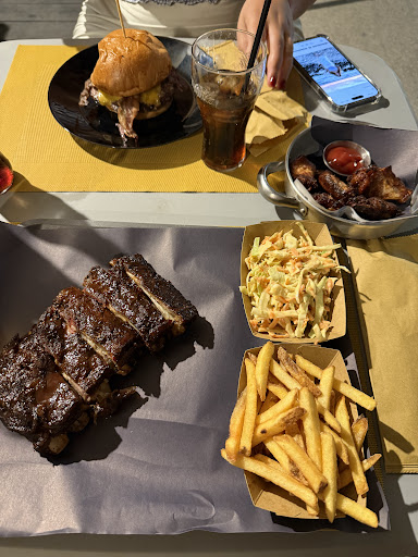 Siamo a San Vito per le ferie e Su consiglio di amici ci rechiamo in questo locale piccolo con tavolini fuori, su una traversa del corso principale di San Vito. Il personale è tutto giovane, sorridente e dinamico. Ci sediamo e ordiniamo, una ragazza bionda molto carina e disponibile ci prende l’ordinazione, con due bambini e due nonni indecisi li mandiamo un po’ in confusione, non so come abbia fatto la cameriera ma l ordinazione è stata presa correttamente…in meno di 10 minuti arrivano gli antipasti: alette di pollo (che mio nipote non riusciva a togliersi dalla bocca tanto erano buone), e baby ribs di maiale che si scioglievano in bocca, in ultimo porzione di patatine fritte: sfiziosità rara che consiglio di assaggiare perché non hanno nulla a che vedere con le solite patatine. Finiamo gli antipasti poi tempo giusto di una sigaretta, ci sparecchiano e ci portano i piatti principali. E qui ci si diverte veramente. Il mio compagno prende un burger di pulled pork, era talmente farcito che quasi non si riusciva ad addentare, sapore buonissimo e il pork era talmente morbido che non dovevi nemmeno masticare, solo godere… Io ho preso le ribs di manzo, anche queste si scioglievano in bocca e l’affumicatura non era eccessiva, quindi si sentiva il sapore della carne e il sapore di affumicatura senza che un sapore coprisse l’altro: un ottimo equilibrio di sapori finito in 3 minuti perché era troppo buono. I nonni anche loro si sono presi le ribs, solitamente molto tradizionalisti si sono stupiti di quanto si potesse godere della cucina BBQ (evviva abbiamo convinto anche loro). I nipoti inutile dirlo, si sarebbero schiaffati tutta la cucina se avessero avuto stomaci più grandi, ma per fortuna conoscono la sazietà e si sono fermati al piatto quasi finito (anche perché le porzioni sono giuste: non troppo abbondanti ma saziano un adulto). Per finire, o meglio per golosità, abbiamo preso anche 2 cheesecake: una ai fichi e una ai frutti di bosco… un piacere per le fauci, ero convinta di essere sazia ma appena ho assaggiato un cucchiaio di cheescake non ho resistito dal finirmela :D Insomma davvero tutto ottimo, dall antipasto al dolce passando per i piatti principali. Ero talmente estasiata dalla cena che sono andata a pagare talmente felice che non ricordo quanto abbia speso (pagato con pos) ma sicuramente non ho speso un capitale altrimenti me lo ricorderei ;) E visto il servizio professionale e veloce non ho resistito dal lasciare un po’ di meritata mancia. Non vengo spesso a San Vito perché è molto affollata, ma se ricapiterò da queste parti tornerò sicuramente a...