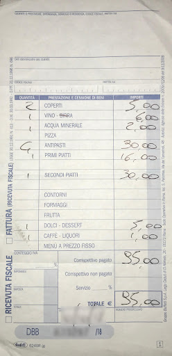 You can take a look at the invoice - 30 Euros for the antipasti (couple of small stuff on a plate) and 30 Euros for the second plate (couple of small stuff on a plate). The first plate was only like a little piece.