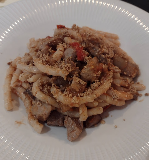 This was our sixth night in San Vito, and we've been on a quest for the best busiate alla Norma, so we ordered that and also took a punt on the very interesting-sounding busiate al tonno in a pesto sauce of citrus fruits and aubergine/eggplant. Oh, mamma, che meraviglia! We've been swapping dishes halfway through most meals, to sample each others, but neither of us wanted to give up our respective meals here. We did each get a forkful, though, and Amuri's Norma is definitely the best in town so far.