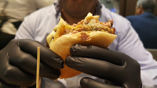 Panino, il pane è da migliorare non si lega alla carne durante la masticazione, copro estraneo - Hamburger ottima Qualità!! e cotto a meraviglia!! però non a tutti piace lo strato crudo al interno, quindi è meglio specificare al cameriere (se non chiede) la cottura carbonizzata :D onde evitare di rimandare il panino indietro in cucina. Ho trovato carino i guanti Total Black forniti per mangiare il panino con i guanti ti permettono di rimanere pulito e guastare il panino sino alla fine!!!.