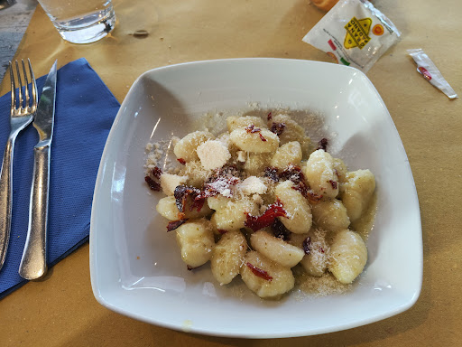 Read moreVenetti al seller oltre un decennio fa e mi promisi di tornarci solo e unicamente per causa di forza maggiore, ebbene la promessa é tutt'oggi intatta. La prima causa é la scarsa illuminazione interna forse progettata dal conte Dracula ; solo il 30% dei posti a sedere ha una luce appena sufficiente da poter vedere quello che si sta mangiando. In questa occasione avevo di fronte un mio vecchio amico particolarmente abbronzato che potevo riconoscere solamente dalla voce; altri tavoli più sfortunati sembrava fluttuassero fra le tenebre. Soffitti color grigio nero e pareti con tonalità scure dovrebbero essere per forza accompagnati da un rafforzamento delle luci. Per quanto riguarda il cibo io ho ordinato una pizza di quelle novità speciali, servita su un vassoio "marrone scuro" tipo mensa. La pizza dalla forma similmente rettangolare non era male al centro ma.... ai bordi é doveroso conferire il record assoluto in quanto alla consistenza granitica, cemento armato, per riuscire a tagliarla o perlomeno a scalfirla serve attrezzatura da officina e denti widia. I panini hamburger che ho visto girare avevano un bell aspetto ma un po' piccini (...e a 12 euro mangi pochetto...) Servizio, uno dei commensali ha chiesto la sostituzione della sua birra per il gusto strano e lo hanno lasciato senza qualcosa da bere per mezz'ora fino alla sua giustificata lamentela. Di tre ragazze che hanno servito al nostro tavolo una molto gentile ,mentre le altre due erano chiaramente scocciate. Alla prossima...
