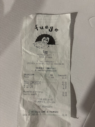 We had a weird situation here, let me explain. We went there to eat some pizza in their terrace, and when we realized it was full of wasps (my wife is terrified of them) we asked if we could drink something while we waited and then take away the pizzas. We ordered 1 ichnusa 0,5L non filtered beer, 1 non alcoholic beer and 1 frizzante water. Non glasses came with it. Once the pizzas were done, we went to pay (pic attached) and I asked: pizzas are 18€, what about the other 14€ (because the bill only says 32€ pizzas). They answered: 5€ ichnusa non filtered, 4€ non alcoholic heineken and 1€ the frizzante water. Then: ok.. what about the other 4€? They said: the cover charge, you sat to drink while you waited.