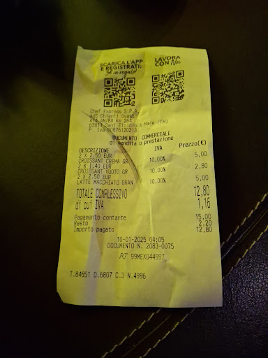 Read moreNon sono solita fare recensioni, ma il ragazzo che ha fatto il turno di oggi 10 gennaio ore 4 del mattino merita la Lode, sia per gentilezza che per efficienza, per attenzione ... ecc Penso sia il miglior dipendente che Chef Express potesse assumere, o che chiunque nel settore della ristorazione potesse assumere. Senza che nessuno gli chiedesse nulla ha notato la difficoltà di mia Mamma nel camminare e le ha offerto la possibilità di non usare le scale per poter usufruire del wc. Un gesto che vale veramente molto. Ma oltre ciò, il garbo, la gentilezza ed il sorriso con cui esercita un lavoro notturno e difficile. Grazie veramente di cuore ❤️ per la meravigliosa persona che ti sei dimostrato. Vorrei avere...