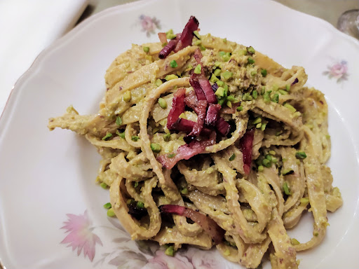 Leggendo tutte queste reviews positive, non posso che pensare che abbiano cambiato lo chef perchè la nostra cena è stata DISASTROSA! Abbiamo ordinato due tipi di tagliatelle: quelle al pistacchio e guanciale e quelle al radicchio e burratina. Nel primo caso, il guanciale era solo di guarnizione: una micro manciatina per altro carbonizzata. Nel secondo caso, la burrata era proprio inesistente e non aveva alcunché di affumicato. La pasta era estremamente dura e completamente insipida. Una vera delusione. Avevamo inoltre chiesto un cucchiaino di sugo rosso con 1 tagliatella (di numero) perchè la nostra bambina di 1 anno potesse assaggiare qualcosa o semplicemente pasticciare in un piatto e ci era stato detto che non c’era problema; invece ci è stato servito 1/4 di piatto di tagliatelle al pomodoro immangiabili per le quali abbiamo pagato ben 4 euro. Anche il pane di accompagnamento (solo 1 ciotolino per una tavolata di 7 persone) era stantio e sembrava comprato due giorni prima al supermercato. L’unica nota positiva è stata la gentilezza...