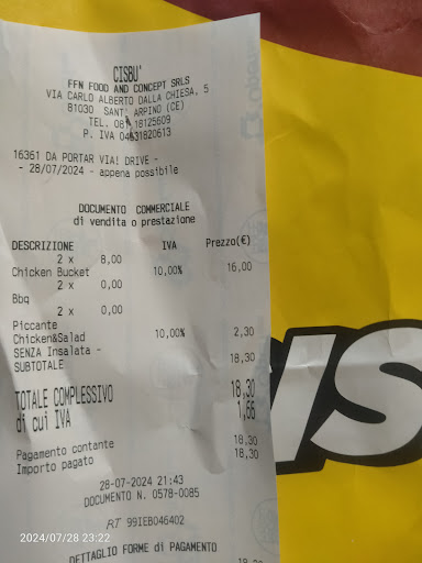 Abbiamo voluto dare fiducia a questo locale ma dobbiamo dare ragione alle recensioni negative. Abbiamo preso due chcken bucket ma a parte i nugghets il resto era immangiabile, pollo che puzzava, crudo con all' interno il sangue. Ma non le leggete le recensioni? Perché non vi migliorate? Il pollo crudo non si può mangiare ed è stato cestinato. Per mio figlio abbiamo preso un panino chcken salad, senza insalata ma la cotoletta all'interno era grande quanto due nugghets. Concordo con chi ha scritto: "è stata la prima ed ultima volta", anche per noi sarà così, eppure andando pazzi per il pollo fritto ed essendo in zona avremmo potuto approfittare, sarebbe stata una comodità ma mai più. Moooolto, moooolto meglio KFC, vorrà dire che non cambieremo la via vecchia per la nuova. Ho dato uno perché zero non mi faceva pubblicare la recensione ma manco uno vale. Rispondo dopo la.vosta risposta: ci sono varie foto in allegato alle varie recensioni ma comunque non ne avete tenuto conto dato che a distanza di mesi il pollo lo continuate a servire crudo. Forse le sarà sfuggito ma abbiamo fatto l asporto, siamo andati a casa a mangiarlo, secondo lei dovevo ritornare per farmi riconsegnare altro pollo crudo? Così come hanno scritto gli altri? A me non interessa screditare il locale, in tasca non mi entra niente anzi, ho buttato 20€( e risparmiato la benzina per riportarlo indietro) voi in tutto questo ieri ci avete guadagnato ma per quanto ci riguarda sarà l ultima volta, pensate a migliorarvi, preoccupatevi di assicurare di consegnare alimenti correttamente cotti e per il panino da 2.30 avete consegnato solo un panino gigante completamente vuoto, cosa che negli altri fast food non fanno e hanno anche prezzi inferiori ma non preoccupatevi del panino è il male minore. Ripeto pensate a migliorarvi anziché di...