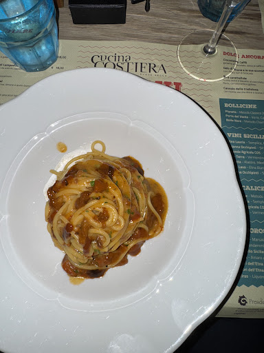 La pasta con le sarde è semplicemente imbattibile, un’esplosione di gusto che conquista al primo assaggio. La pasta con i ricci è eccezionale: intensa, cremosa, perfettamente bilanciata. E poi la chicca finale: il dolce con pere e ricotta. Favoloso, equilibrato, avvolgente. È il mio preferito in assoluto, e ogni volta riesce a sorprendermi.