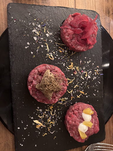 Ci è stato consigliato e abbiamo provato,partiamo dalla chiamata per prenotare,ho chiamato e subito probabilmente non riusciva a rispondere ma tempo un minuto mi ha richiamato nota non da poco secondo me,ho chiesto,visto che abbiamo una bambina di un anno e reduci da un esperienza poco piacevole in un altra griglieria ho chiesto cosa proponevano per i bambini così piccoli,mi ha risposto che la carne era molto morbida che avrebbe potuto mangiarla anche lei ma io non ero molto convinta e lui capendo la mia perplessità mi ha subito detto che si sarebbe organizzato per eventualmente una pasta,risultato siamo arrivati in questo posticino molto carino e accogliente,il ragazzo che ci ha accolto,credo uno dei proprietari,molto in gamba e attento ad ogni richiesta,ma lo avevo già capito dalla telefonata.Ci sediamo arriva subito la pasta al pomodoro per la bambina che ha mangiato davvero di gusto,e un tagliere di affettati per suo fratello di 7 anni,intanto che noi decidavamo cosa mangiare.Noi abbiamo mangiato un tagliere di formaggi accompagnato da delle confetture spettacolari un carpaccio altrettanto buono,due tagliate molto buone e del vitello per il bambino che era burro molto molto buono e che ha apprezzato anche la bambina di un anno.Per concludere una buonissima Crostatina ai mirtilli,arrivata con su la candelina che avevo chiesto durante la telefonata per festeggiare il compleanno di mio marito e due sorbetti a limone anche loro buonissimi.Un esperienza davvero fantastica cibo ottimo noi non beviamo vino ma c'era una scelta enorme di vini,prezzo in linea con tutto ciò che è il cibo,il posto meraviglioso e la cordialità mostrataci. Davvero complimenti complimenti complimenti,stra...