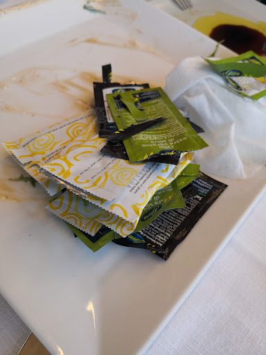 I'd call this place a "tourist trap". Food quality is quite low (the bacon is too chewy to swallow, the shrimp risotto has close to no shrimps in it, and the pesto is more yellowish than the typical green Ligurian pesto you'd find everywhere else). The service quality is also low (see pictures for olive oil and condiments "packets", and the powdered pepper instead of crushed pepper or pepper mill, leaving a pile of garbage behind from all the packets!). And to top it off, the waitress was amazingly impolite, literally throwing the plates and water on the table as she was already moving away from the table, and rolling her eyes if we called her for ordering more drinks or to ask for the bill. The high prices don't reflect the low quality and it's clear they target a tourist clientele and don't expect to attract returning customers. The high volume of Google ratings must be tailored, since it really does not...