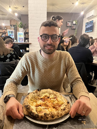 Per puro caso ci siamo trovati in questa pizzeria e siamo contenti che il fato ci abbia indicato questa location. Ha un grande parcheggio gratuito e diverse sistemazioni di cui due esterne e una grande interna. Siamo stati accolti da un personale simpaticissimo, sorridente e attento. Ci siamo accomodati e dopo aver scelto cosa mangiare dal menu scannerizzato ci è arrivato subito un antipasto di bruschetta, frittatina e crocchè che abbiamo diviso in due. Dopo 20 Min sono arrivate le pizze: una Ariccia con porchetta e una bianca con cotto. Con l'aggiunta di 2 birre, 0,40 e 0,20 abbiamo pagato 32 euro. Servizio velocissimo e cambio di posate ad ogni portata. Rivedete solo i 2 euro di coperto per un tovagliolo di carta perché sono eccessivi ma non abbassiamo il voto perché siamo stati bene e le pizze sono risultate digeribili. Camerieri super. Consigliato. Ciao da Roby e Lucy da Sant'...