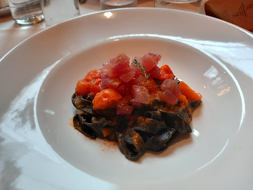 Read morePer un pranzo di lavoro, sono stata portata qua da un collaboratore. Il locale è molto raffinato e fa tanta scena. Il menù del pranzo è vario con con primi piatti ricercati e secondi più basici. Primo impatto decisamente positivo! In aggiunta alla scelta dei primi/secondi è possibile scegliere piatti a buffet. Con 5 euro puoi portare in tavola un piccolo piattino di buffet misto di verdure cotte in vario modo, legumi, uova al forno, tramezzini e crocchette. Buon prezzo onestamente, considerando che di solito con 4 euro, in un locale medio, ti portano 3 fette di melanzana alla griglia! Il tempo di attesa per i primi è stato molto limitato. Fettuccine al nero con tartare di tonno con bottarga e pomodorini da "dieta" ma squisite. Peccato però che il cameriere mi ha tirato via il piatto da sotto il naso proprio mentre stavo allungando la mano alla ricerca del pane per fare la scarpetta. Capisco la fretta: qualcuno entrato dopo di noi stava attendendo in piedi... ma a mio parere è un atteggiamento insopportabile. Tolgo un punto per il pressing (anche se non voluto). Prezzi medio-alti, forse troppo (tranne per il buffet, che reputo ok)....