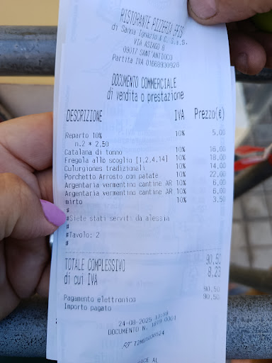 Read moreGentili gestori, Siamo stati ospiti nel vostro ristorante il 10 agosto (eravamo in sette) con la mia famiglia in occasione del nostro 28° anniversario di matrimonio. Siamo venuti da voi, perché 3 anni fa celebrammo li 25° e ci trovammo benissimo. Capisco che voi abbiate una clientela fidelizzata da dover privilegiare, ma essere stati trattati in questo modo ci è sembrato molto sgarbato. Mi dispiace aver buttato lo scontrino ma allego pagamento pos. La sistemazione in fondo al terrazzo.. con un caldo insopportabile, siamo arrivati alle 8,30. L'antipasto servito normalmente, per i primi piatti abbiamo dovuto aspettare le 22,30 dopo sollecitazioni. Ci hanno servito tra le altre cose: Carpaccio di tonno: Veramente peccato umiliare un tonno di prima qualità come quello servito... non ci vuole tanto: un pò di sale e limone! Linguine a i frutti di mare: io non amo la pasta mantecata, ma la salsa deve essere stata versata in tutta fretta sulle linguine dopo le nostre proteste. Culurgiones: Fatti in casa senz'altro. porzione minuscola. L'impasto della sfoglia non aveva la consistenza che si addice a questo capolavoro della cucina sarda. Li ho mangiati a casa di un amico a Porto Botte. Le posso fare avere la ricetta dalla sua mamma. Ricciola: Pesce freschissimo rovinato!! malgrado la pomposa descrizione aveva meno sapore dei bastoncini findus. Avevamo preso una torta per festeggiare ! siamo dovuti scappare alle 23 dalle 20,30 che eravamo lì per il caldo insopportabile e l'insofferenza per l'attesa. Veramente tutto spiacevole!! Caro gestore, rifletta e "China su fronte" alla cucina sarda e la temperanza del suo popolo. Per noi pazienza una serata...