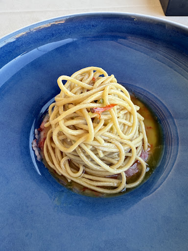 Abbiamo iniziato con un vitello tonnato rivisitato con tartare di manzo: raffinato, sorprendente, un equilibrio perfetto tra tradizione e innovazione. A seguire, un spaghetto con cozze e bottarga saporito, avvolgente, assolutamente impeccabile. Ma non solo: anche i piatti vegetariani come la zuppa di piselli con burrata e limone o la pasta al pomodoro hanno conquistato per intensità, freschezza e finezza.