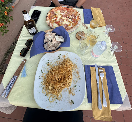 The restaurant is located close to the main road and is clearly visible when passing by while driving. There is a road where you can park you car or, ideally, you can leave your car close to the church parking. The place is nice, family friendly, and as my girlfriend told me, they used to play misic to let the guest enjoy their time dancing and listening to music We ordered 4 pizzas and they took a while because the order wasn't placed correctly... The pizzas were served almost one hour later our order, but they were really apologetic and kind, so we just ate it an left without complaining too much. The quality is good, but doesn't reflect the price you're paying for... The pizza is a bit dry and the dough is not...